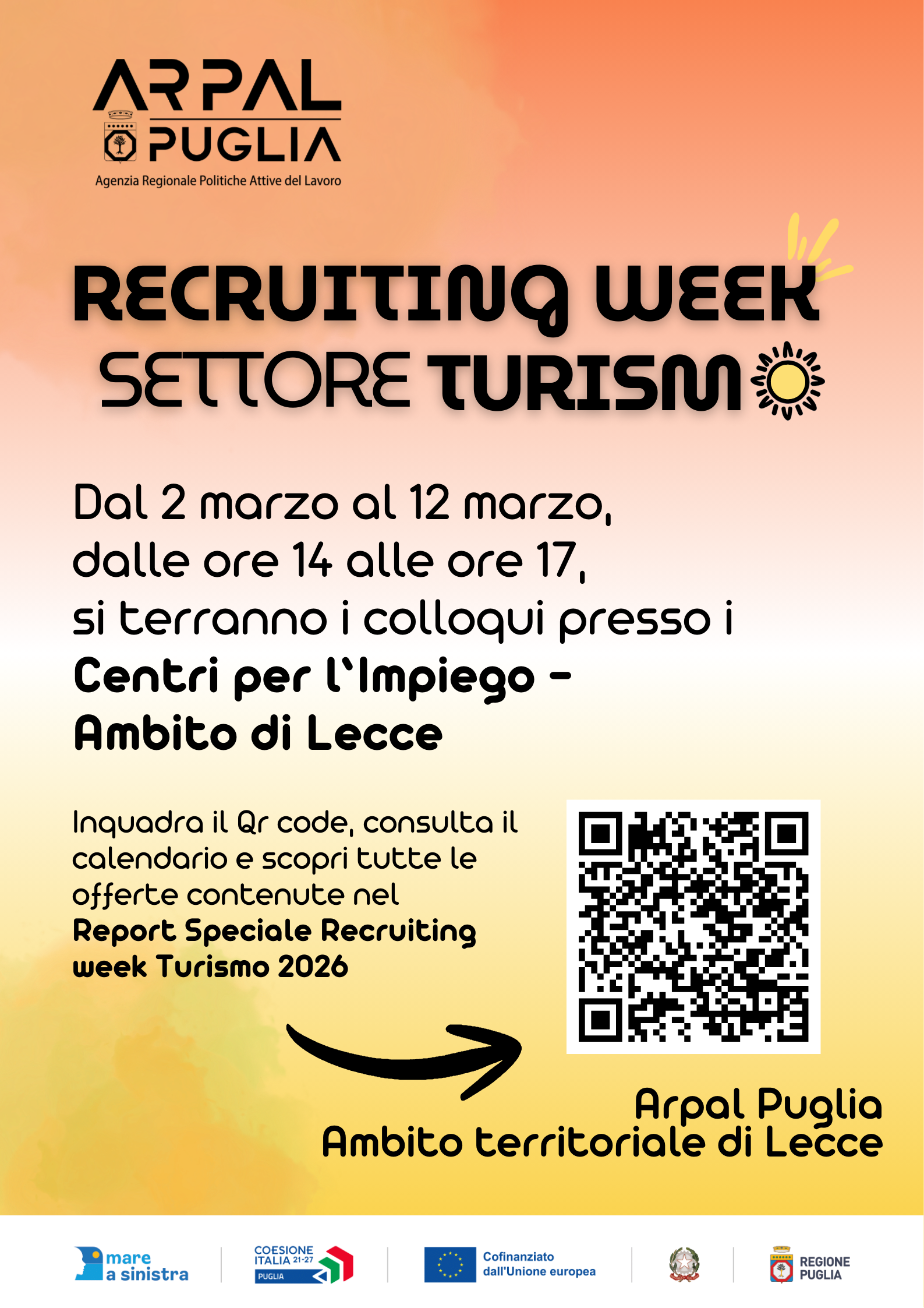 Dall’2 al 12 marzo 2026 Arpal Puglia – Agenzia regionale per le politiche attive del lavoro – organizza una recruiting week per oltre 105 aziende del settore turistico della provincia di Lecce.